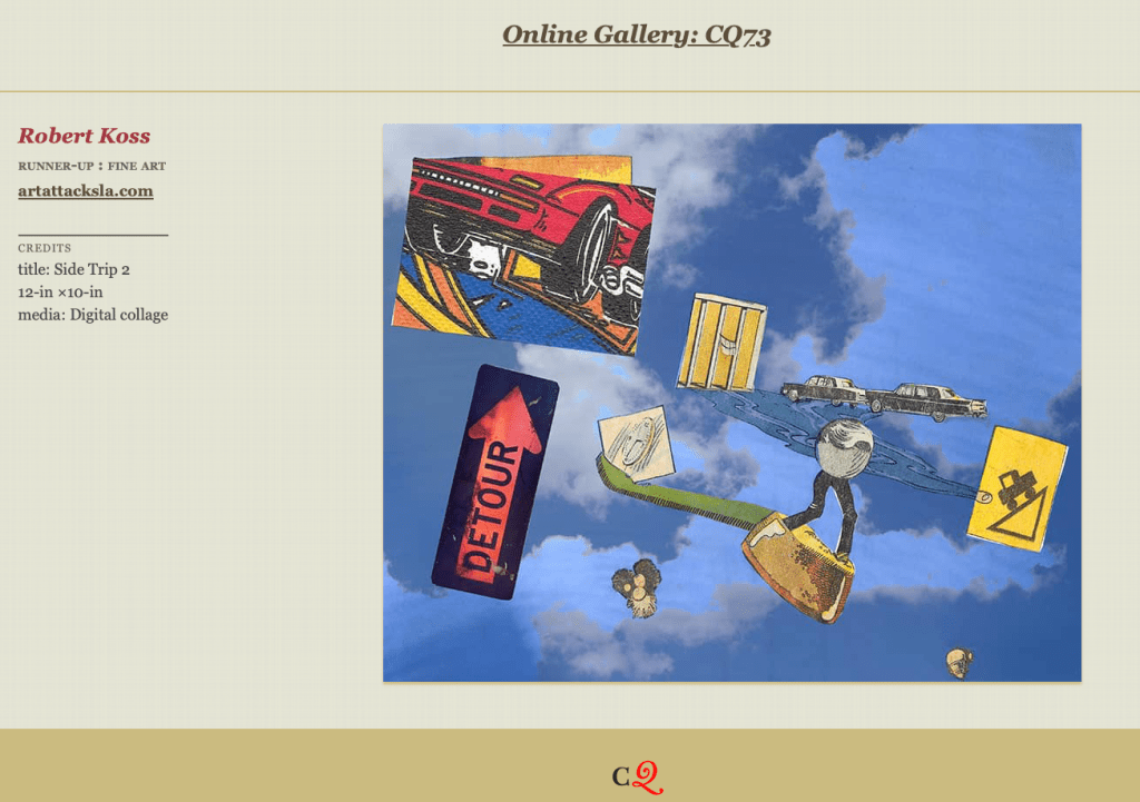 Two works by Robert Koss are featured in the Online Gallery: CQ73 as runner-ups in the fine art category. Both works are digital collages originally done years ago and then revisited last year.