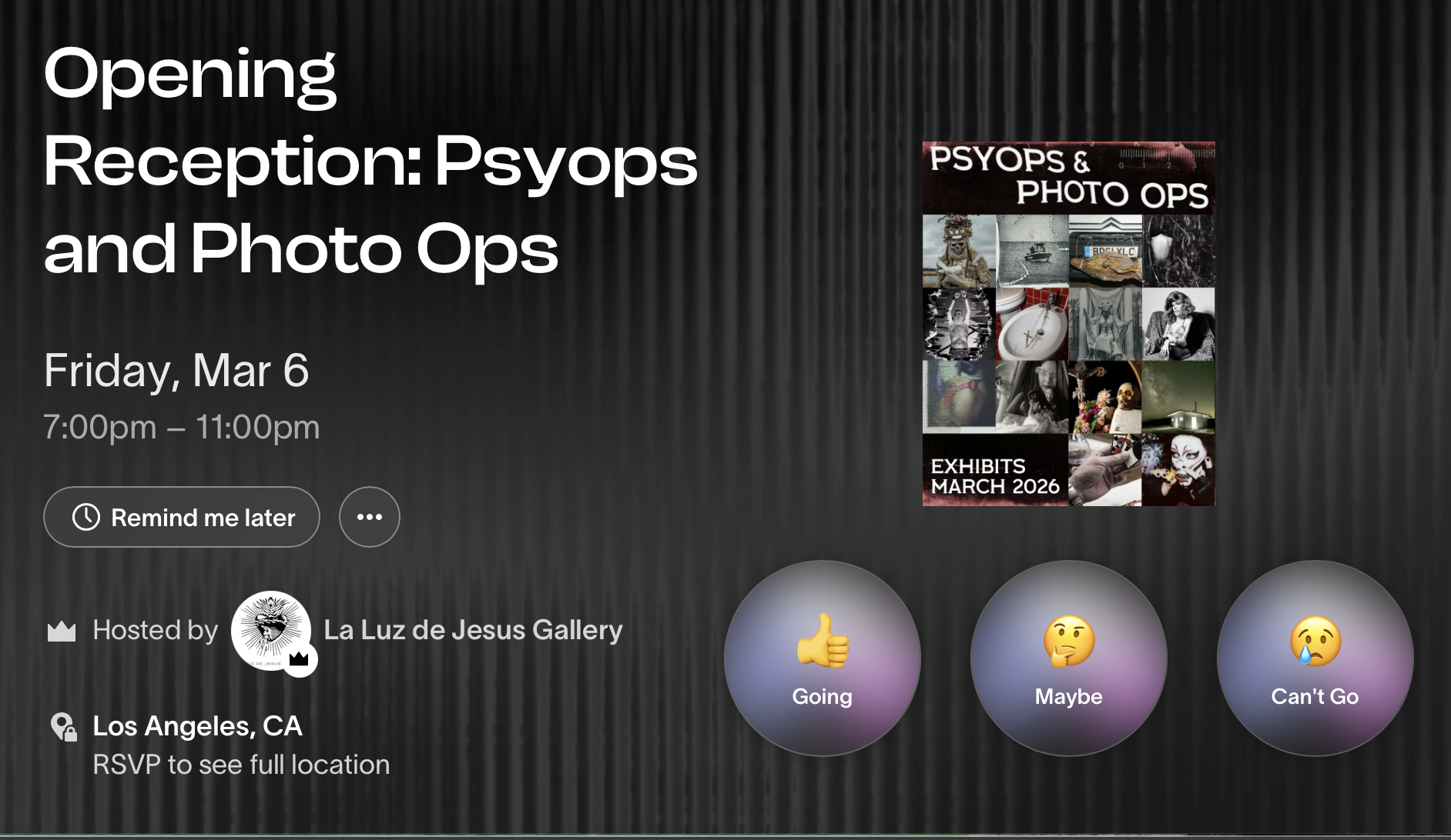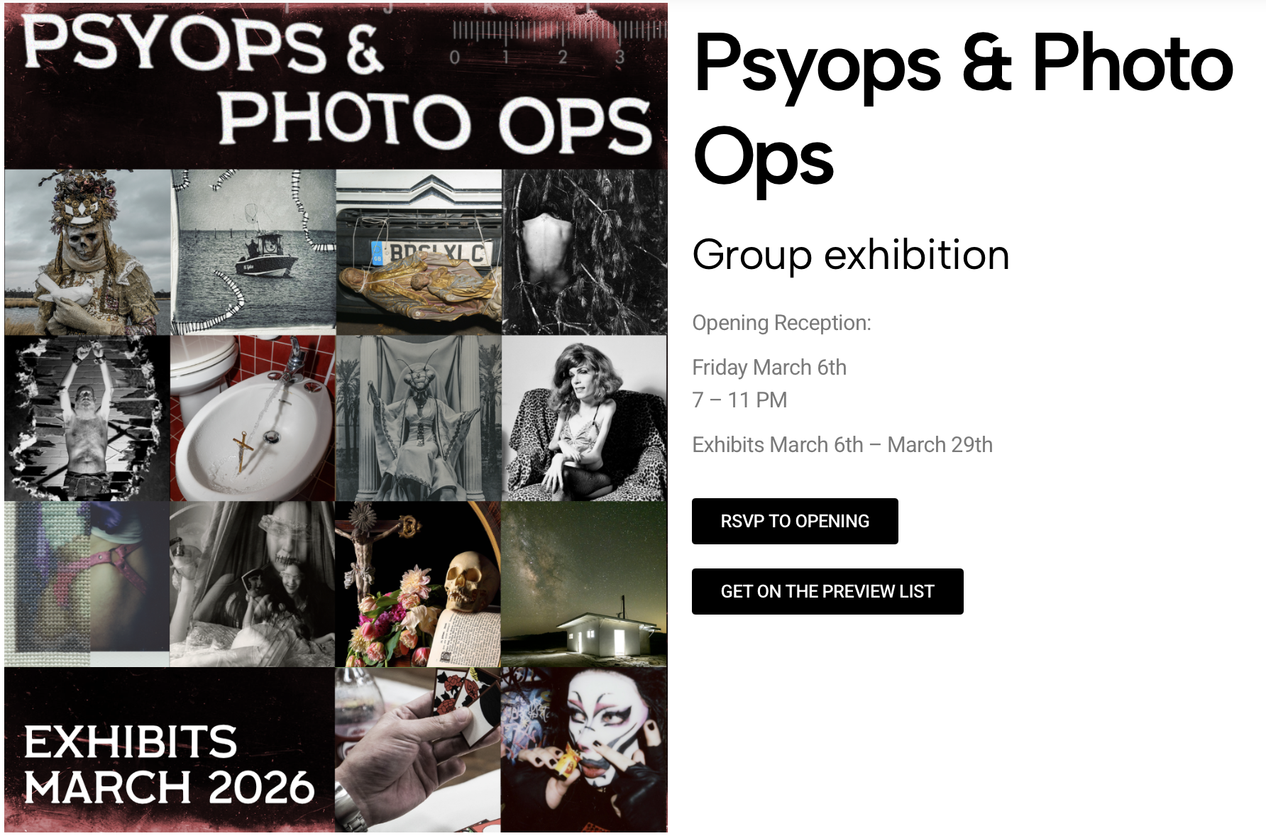 Join us! Sign up now to RSVP for the Opening and, why not, get on the Preview list. Go to https://laluzdejesus.com/psyops-and-photo-ops-photography-group-show/ , above, and click on one or both of the options!